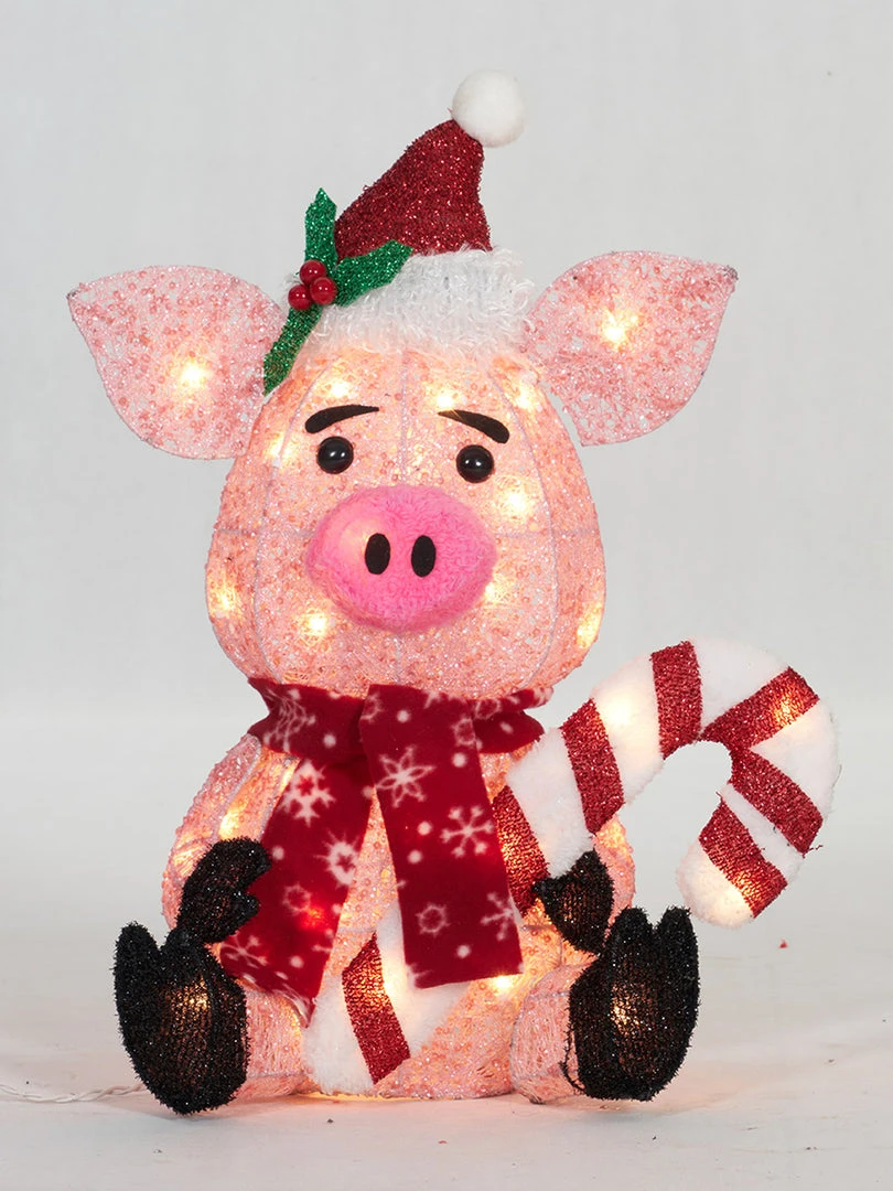 Let this sweet little 20-inch Glittering Thread Pig with Candy Cane Sculpture welcome friends and family to your home! Sculpture is pre-lit with 35 clear incandescent, steady-burning bulbs and is designed for both indoor and outdoor use.