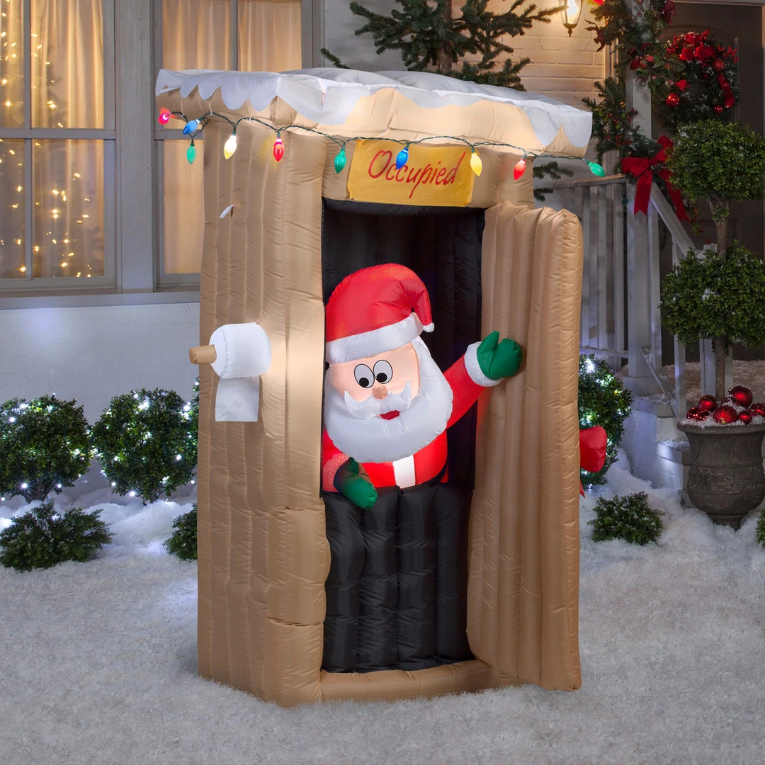 Express your holiday spirit with this Inflatable. Santa is adorably embarrassed as he peeks out of this outhouse! This decoration features energy-efficient LED lights; and deflates for easy storage between seasons.