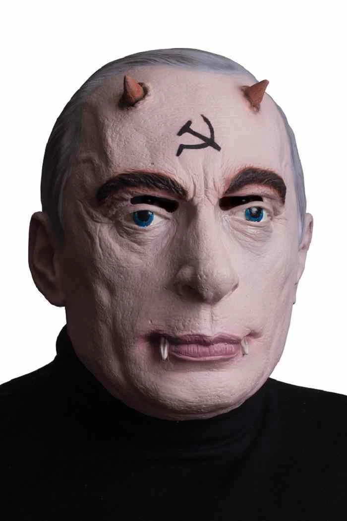 The Vlad the Red latex pullover mask features a full face with blue eyes, a hammer and sickle tattoo on the forehead, fangs and small horns.